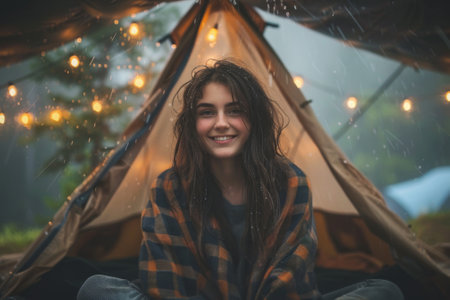 Woman happily sits by a tent with sparkling lights, savoring a rainy outdoor escapade