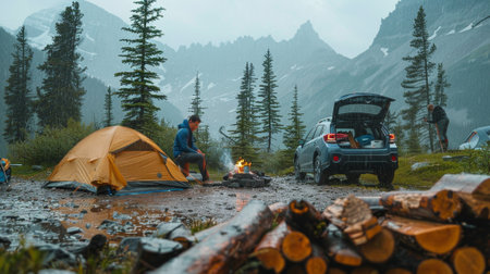 Wilderness retreat: camping, hustle of daily life to find solace in the natural world, setting up tents, cooking over open flames, and creating memories surrounded by beauty and peace of nature.