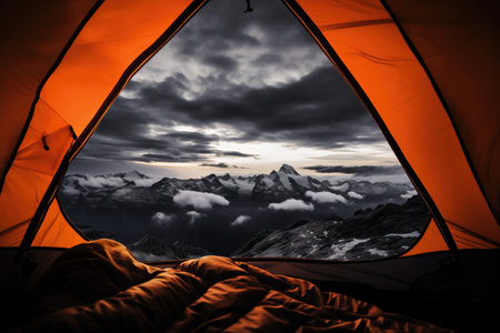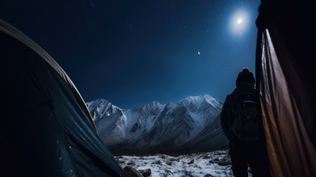 View from the tent to the night snow-capped mountain peaks, active recreation. Travel in nature, tourism. AI generated.