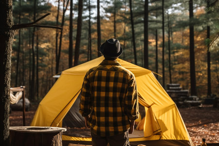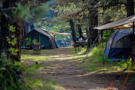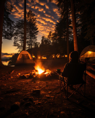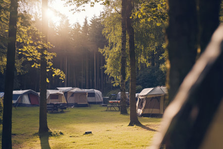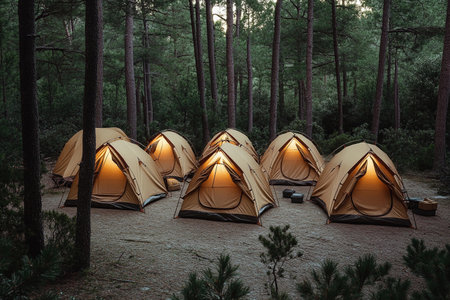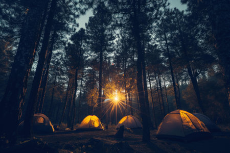 Golden hour twilight camping in the illuminated pine forest with tents under the sunset rays, offering a serene and tranquil outdoor adventure and recreation in the wild habitat of nature