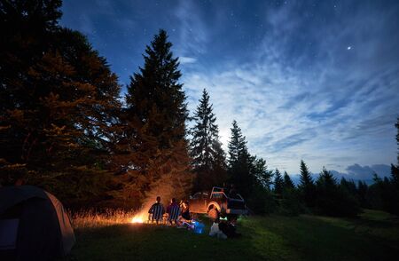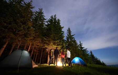 Rear view a group of tourists are standing by a burning fire near the tents against the backdrop of a pine forest under a starry sky. Hills visible in the distance under the evening sky.