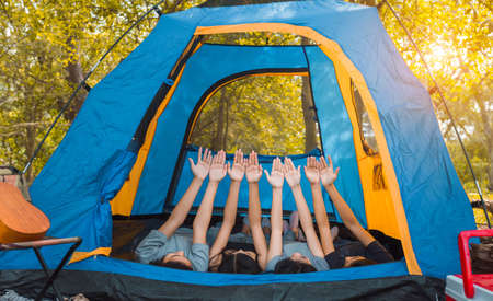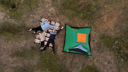 Aerial top view of family in campsite from above, parents and kid relax and lie on plaid, family camp vacation concept