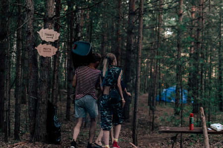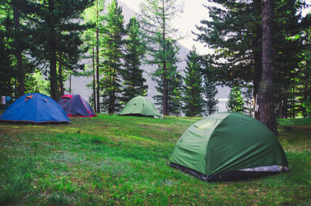 Various tourist tents placed outdoors in the woods. Camping tourists on the background of pine trees in the forest. Tourist romance. Altai mountains Russia Concept Travel