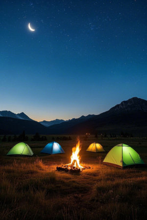 Outdoor campsite campfire and tent night view