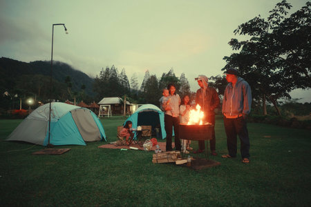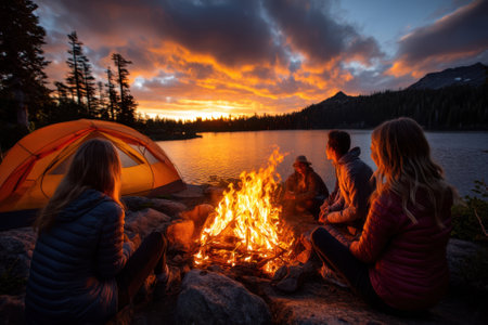 A loving family enjoys camping together as they gather around a warm campfire while watching the sunset sky