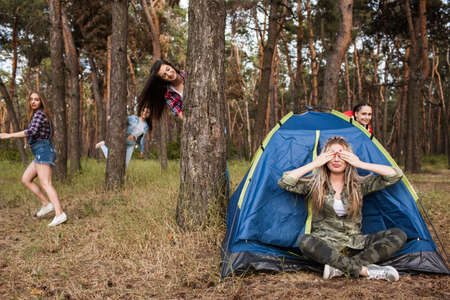 Hide and seek tourist leisure games concept. Woman friendship. Spending time together.