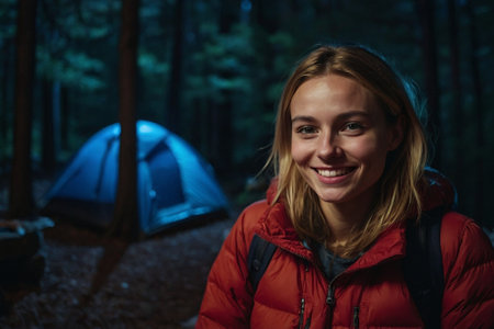 Portrait of smiling young woman in red jacket standing near tent in forest