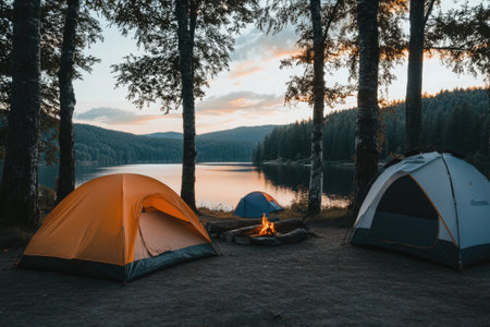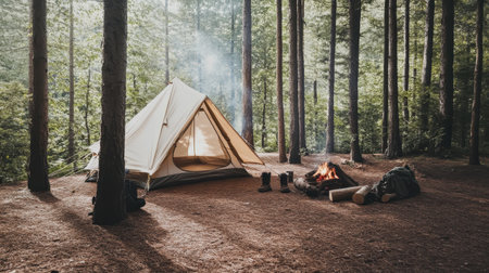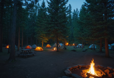 A peaceful camping site surrounded by lush trees, featuring a glowing campfire and tents, ideal for outdoor enthusiasts seeking tranquility and adventure in nature.