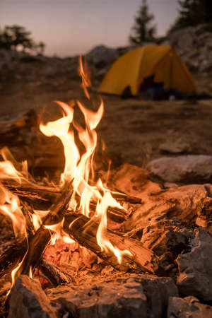 Bonfire burning in tourist camp in mountains.