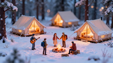 Miniature people: family camping in the winter forest at sunset.