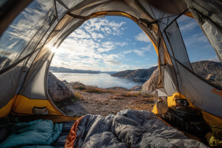 Inside a cozy camping tent, revealing a breathtaking panorama of a greenlandic fjord bathed in the warm glow of sunrise