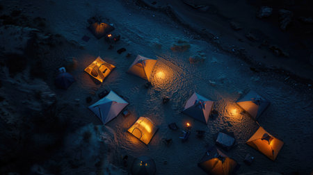 Silhouette of hikers resting besides burning bonfire near illuminated tourist tents on camping site in dark mountains under night sky with sparkling stars. Active lifestyle and outdoor living concept