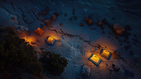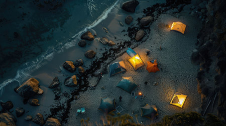 A captivating aerial view of a beach at night with a string of lanterns illuminating the waters edge, creating a magical atmosphere under the cover of darkness AIG50