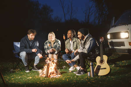Group of young friends sitting near bonfire at night Camping concept, Young people sitting around a bonfire Ai generated