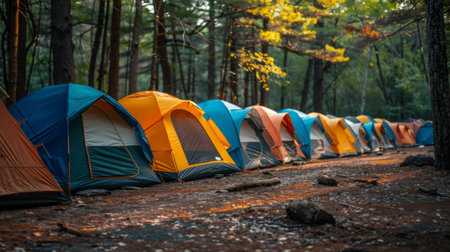 a line of vibrant tents in the forest, evoking a summer camp atmosphere