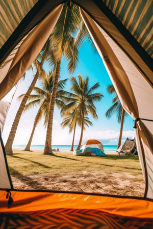 view from tourist open tent on palm trees. Generative AI. High quality illustration