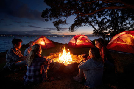 Friends enjoy a warm campfire at a lakeside campsite while tents are visible in the twilight.