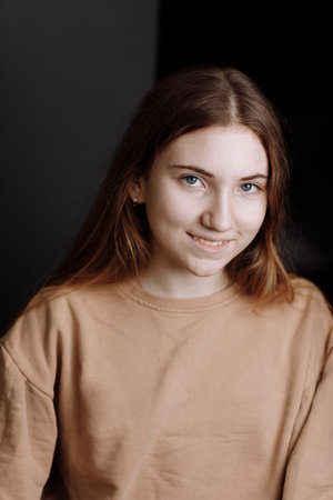 Young woman or pretty girl with adorable face, on black background. Natural beauty