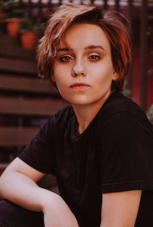 Beautiful young Teenager Girl with a trendy bob hair in a white t-shirt in a outdoor and looking at camera.