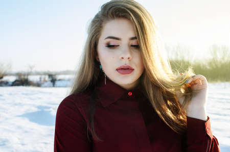 Beautiful woman with long blond hair and red lips posing outdoor.