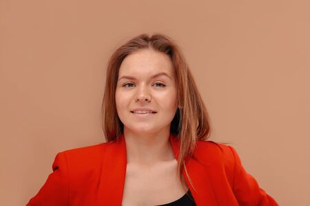 A beautiful girl in a bright jacket. Against a homogeneous background. Bright girl without makeup.