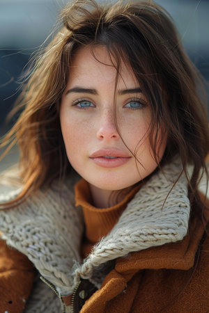 Portrait of a young woman with freckles and blue eyes