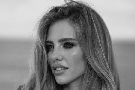 Outdoor portrait of beautiful sensual girl. Black and white photo.