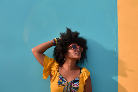 Beautiful young women with afro hairstyle and glasses against colorful background