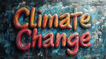 Bold, colorful 'Climate Change' lettering artistically painted on a dynamic textured background. Perfect for themes of environmental awareness and sustainability.