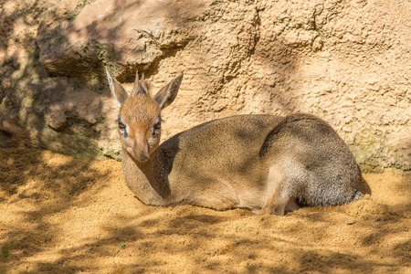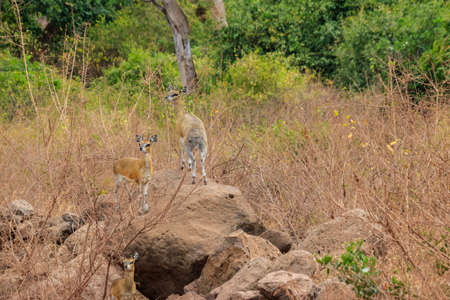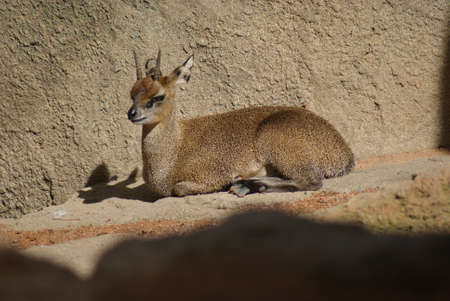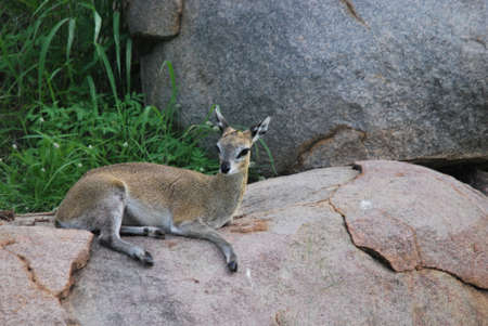 Klipspringer, a small species of African antelope lying on rocks. Safari in Serengeti, Tanzania, Africa