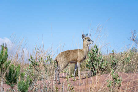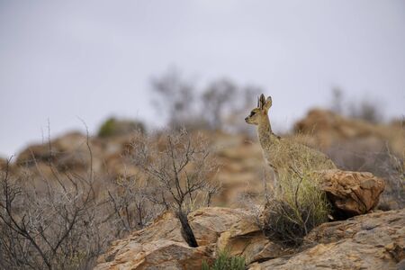 Klipspringer standing on a rock in the Welgevonden game reserve, South Africa.