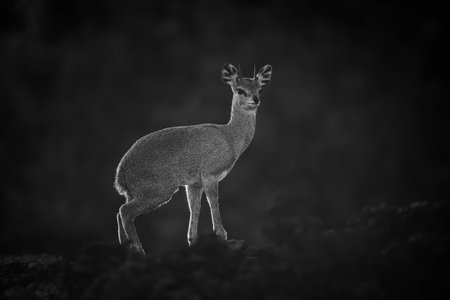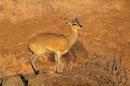 A small klipspringer antelope (Oreotragus oreotragus) standing on a rock, Kruger National Park, South Africa