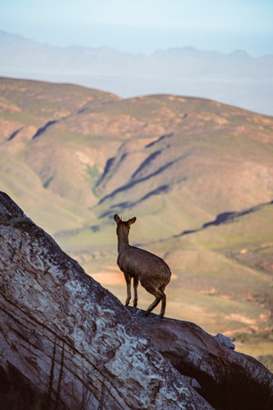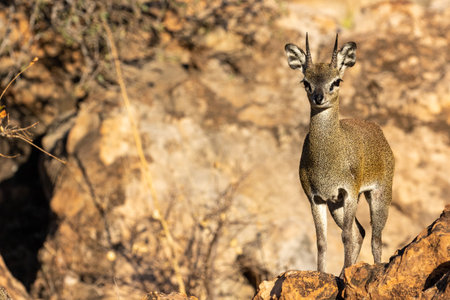 An alert, male klipspringer standing on mountain on the outlook for predators
