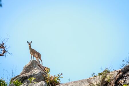 Klipspringer antelope (Oreotragus oreotragus) on blue sky in the background. Plenty of copy space. Animal wildlife