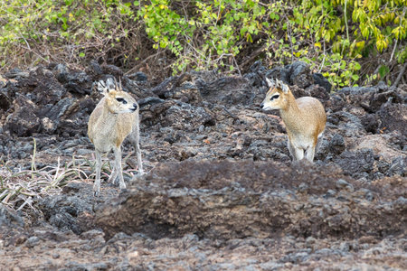 Two Kirk's dik-dik, Madoqua kirkii, between lava stones in Tsavo National Park.