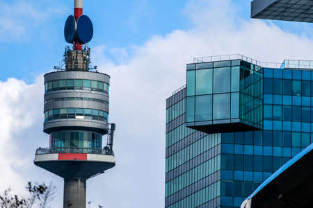 Frankfurt, Hessen Germany - March 4th, 2021: Dramatic shot of the top of the Frankfurt exhibition tower. Close-up of the top of the exhibition tower in Frankfurt am Main.