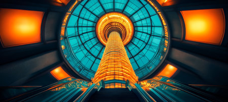 Orange Lit Spiral Staircase in Modern Building, Symmetrical Design, Abstract Architecture