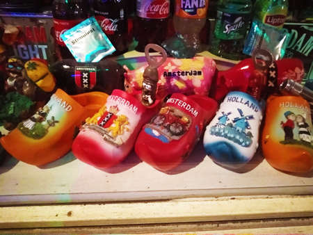 Amsterdam, Netherlands - July 02, 2018: Klomp - Dutch wooden shoes in the shop window
