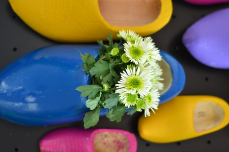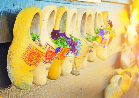 Zaanse Schans, Netherlands - January 10, 2017: Row of old traditional handmade Dutch wooden clogs with blooming flowers in Zaanse Schans village near Amsterdam, Netherlands.