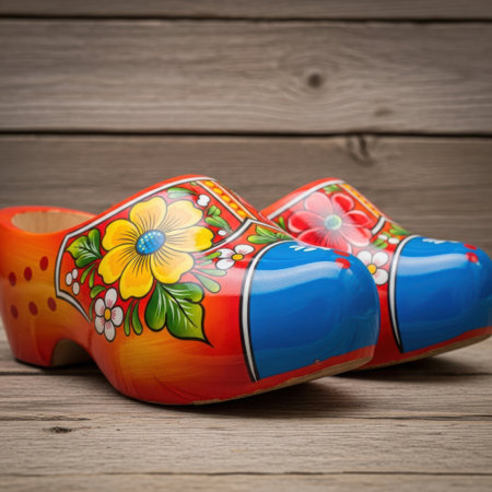A pair of vibrant, hand-painted wooden Dutch clogs with floral designs rests on a weathered wooden surface, showcasing traditional craftsmanship.
