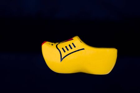 Yellow colored and painted characteristic Dutch wooden shoes against a black background