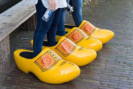 Tourists standing in huge wooden shoes in the Zaanse Schans, a neighborhood with historic wooden buildings in the municipality of Zaanstad.
