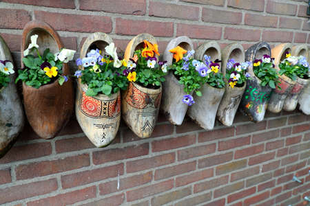Wooden clog shoes on a brick wall serving as flower pot in the Netherlands