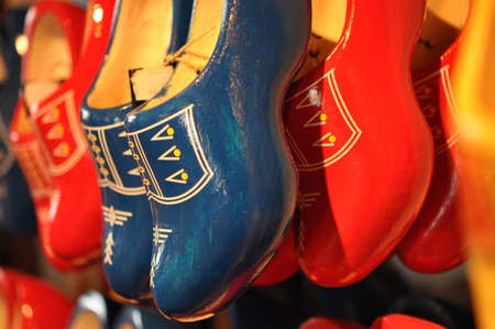 Regional tradition and culture, handmade concept. Wooden dutch shoes, traditional clogs footwear standing in row
