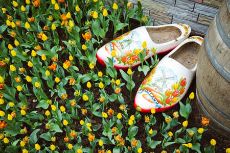 The traditional national wooden shoes Klomp like flowerpots with flowers in vintage style