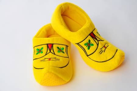 Yellow pair of traditional Dutch wooden shoes on a wooden bench