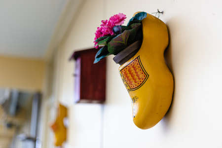 Traditional typical Dutch wooden shoes at wall of house as plants pot, symbol of Holland.
