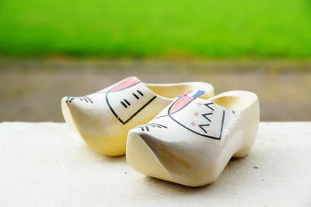 A pair of Dutch traditional wooden clogs on the table outdoors