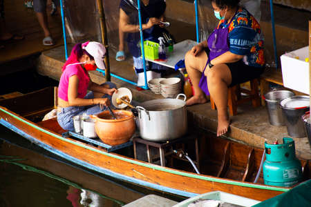 BANGKOK, THAILAND- JANUARY 29, 2016: Unidentified locals sell fresh produce, cooked food and souvenirs while tourist waits of boats for hire. Market is a great tourist attraction located on a Khlong in Thailand.