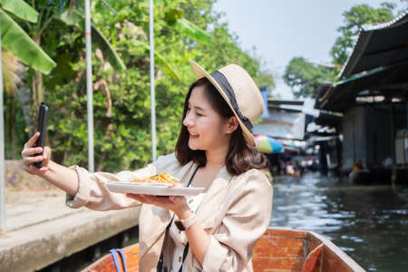 asia female tourists wearing hat holding camera and smartphone take photo vlog live . Beautiful woman take taxi boat visiting Damnoen Saduak floating market,Ratchaburi.